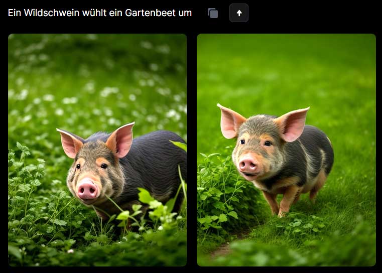 Um den Blogpost „Wildschwein im Garten“ mittels Bild-KI zu illustrieren, hab‘ ich mal ausprobiert, was die gängigen Bilder-KIs so drauf haben. Marktführer Midjourney ist mittlerweile kostenpflichtig und war anfangs nicht dabei. Netterweise haben Limone und Daniel die fehlenden Beispiele beigesteuert!