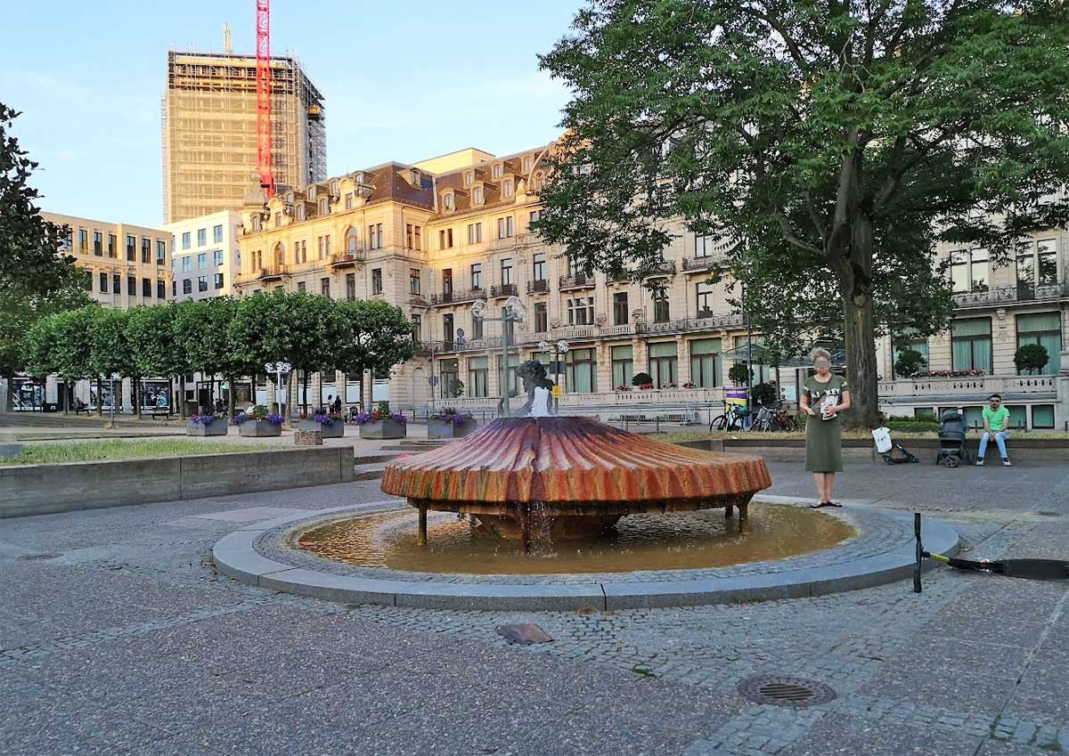 Stadtplanerisch bietet Wiesbaden Seltsamkeiten, z.B. in der Platzgestaltung. Wenn hier in Berlin Friedrichshain ein Platz gestaltet wird, finden vorher mehrere Veranstaltungen zur Bürgerbeteiligung statt – und aus den Vorschlägen machen die Planer/innen das Beste, was geht. In Wiesbaden stellt man offenbar einfach dies und jenes, was irgendjemand vorschlägt, mal eben so auf. So zum Beispiel am Kochbrunnen, ein sehr zentraler Platz in Wiesbadens City, zudem eine „Must-See-Sehenswürdigkeit“. Das ist der Kochbrunnen: