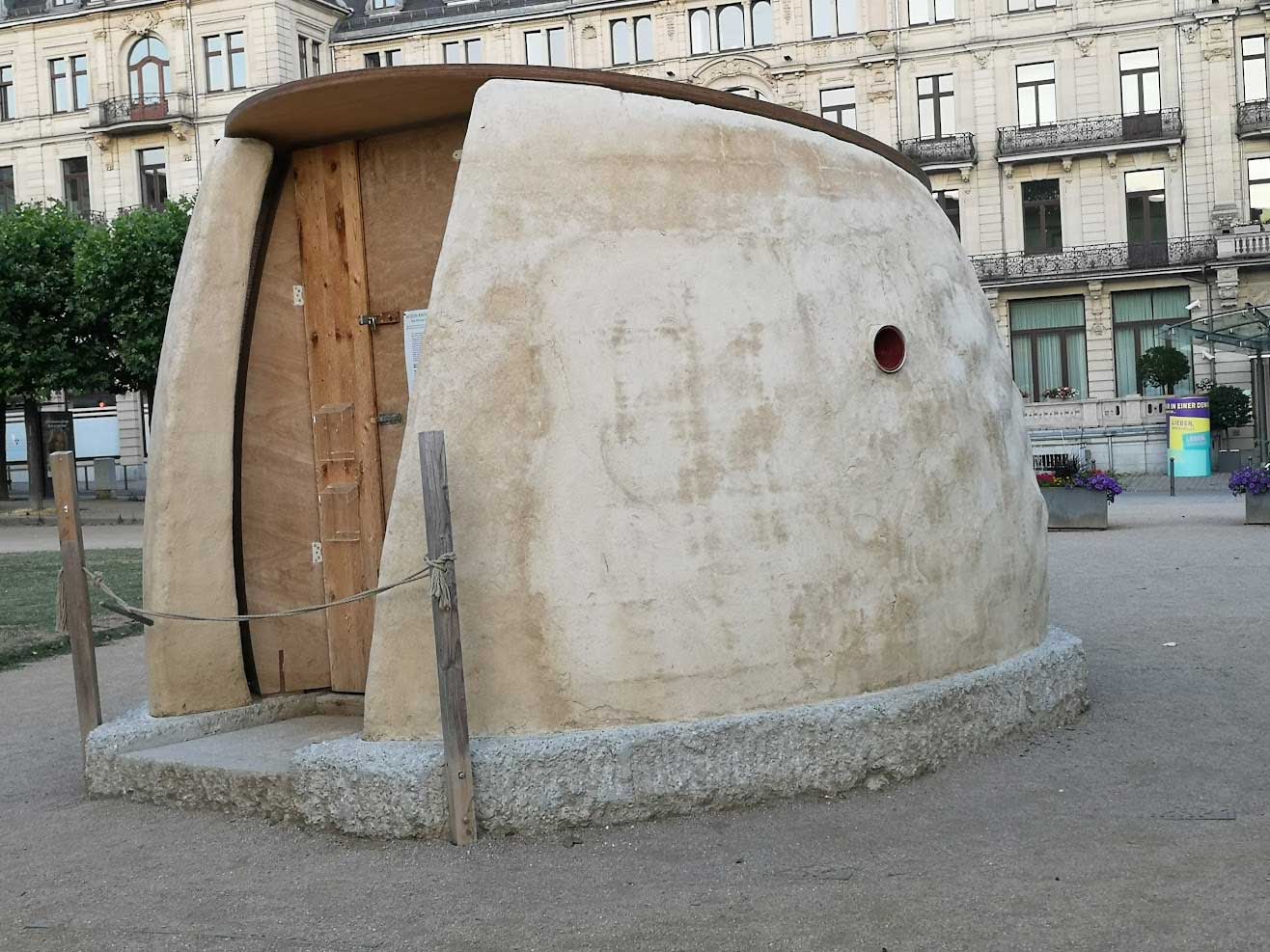 Unfassbar hässlich! Auf der anderen Seite bereichert eine kleine gedruckte Lehmskulptur den Platz, irgendwas mit Fluxus, Lesungen, Literatur…. Das erläuternde Plakat an der Tür des meist geschlossenen Objekts pflegt eine derart abgehobene Sprache, dass der Kontrast zum einfachen Lehmbau nicht größer sein könnte!