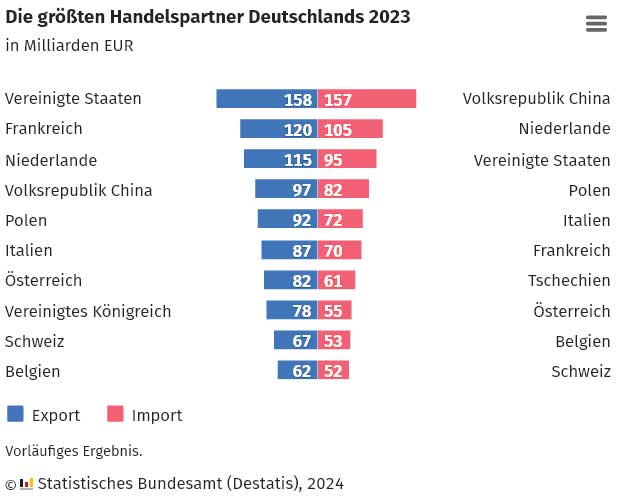 Mit der Abhängigkeit von den USA hat Erndl (und die vielen anderen, die darauf hinweisen) recht, denn sie sind der wichtigste Handelspartner in Sachen Export: